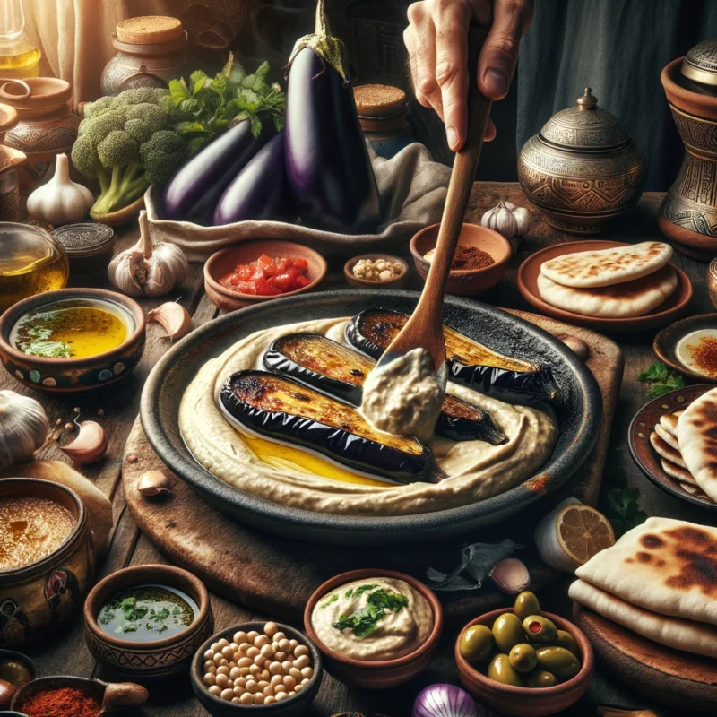 Once the eggplants are perfectly roasted, their charred exteriors are peeled away to reveal the soft, smoky flesh within. This is then mashed to a creamy consistency, a testament to the eggplant’s transformation from a firm vegetable to a spreadable delicacy. To this base, tahini is added—a sesame seed paste that brings richness and a slight bitterness, balancing the natural sweetness of the eggplant.